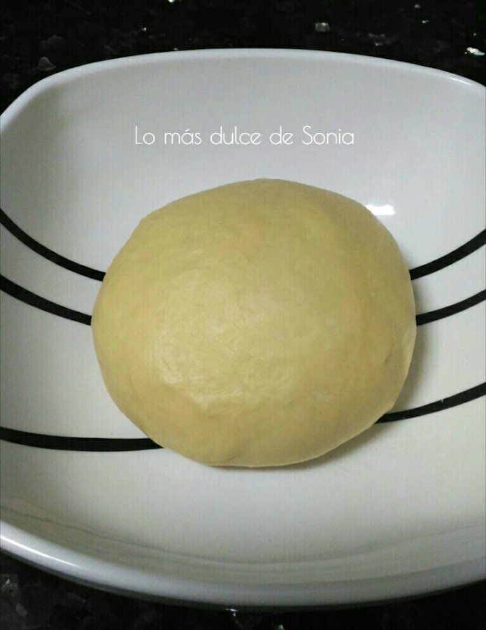 Nos ponemos aceite en las manos, hacemos una bola con la masa, la colocamos en un bol tapado con papel film y dejamos que leve, hasta que doble el tamaño.