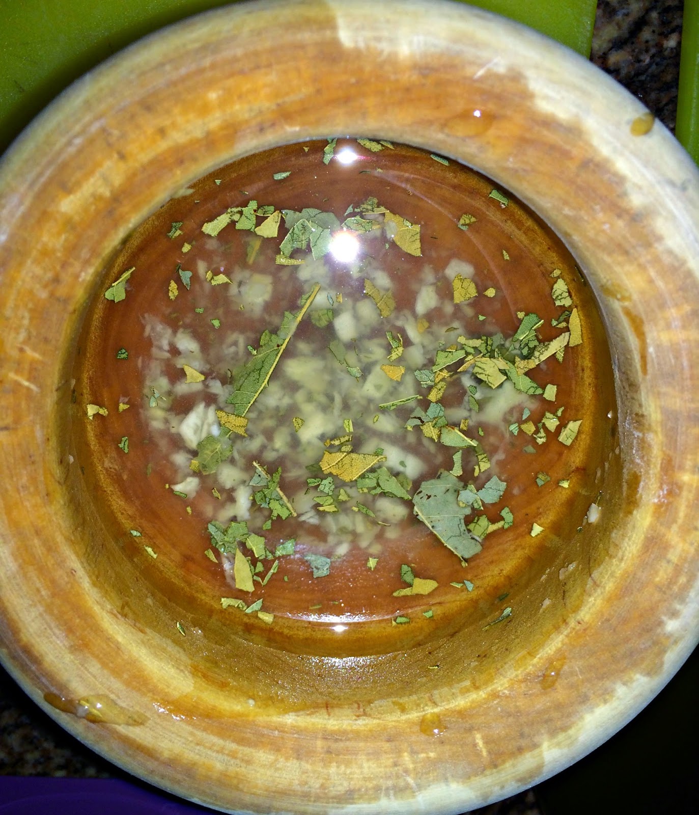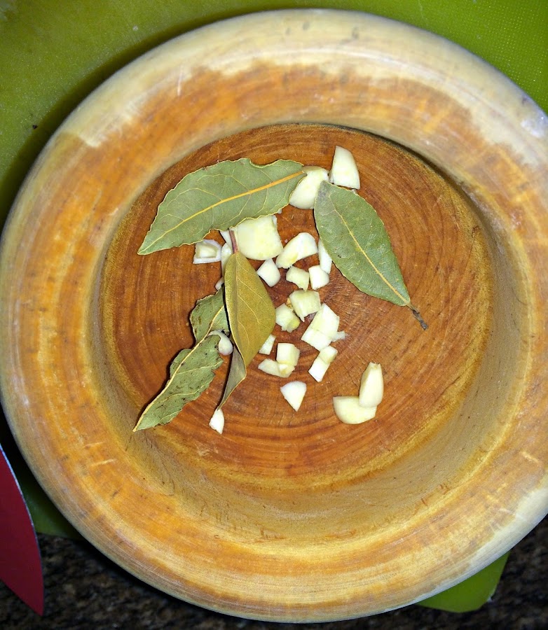 Mientras se hace el cordero, picamos un par de ajos, y los machacamos en el mortero junto con tres o cuatro hojas de laurel grandes, lo añadiremos al cordero junto con medio vaso de vino blanco, una vez hayan pasado los primeros 15 minutos.