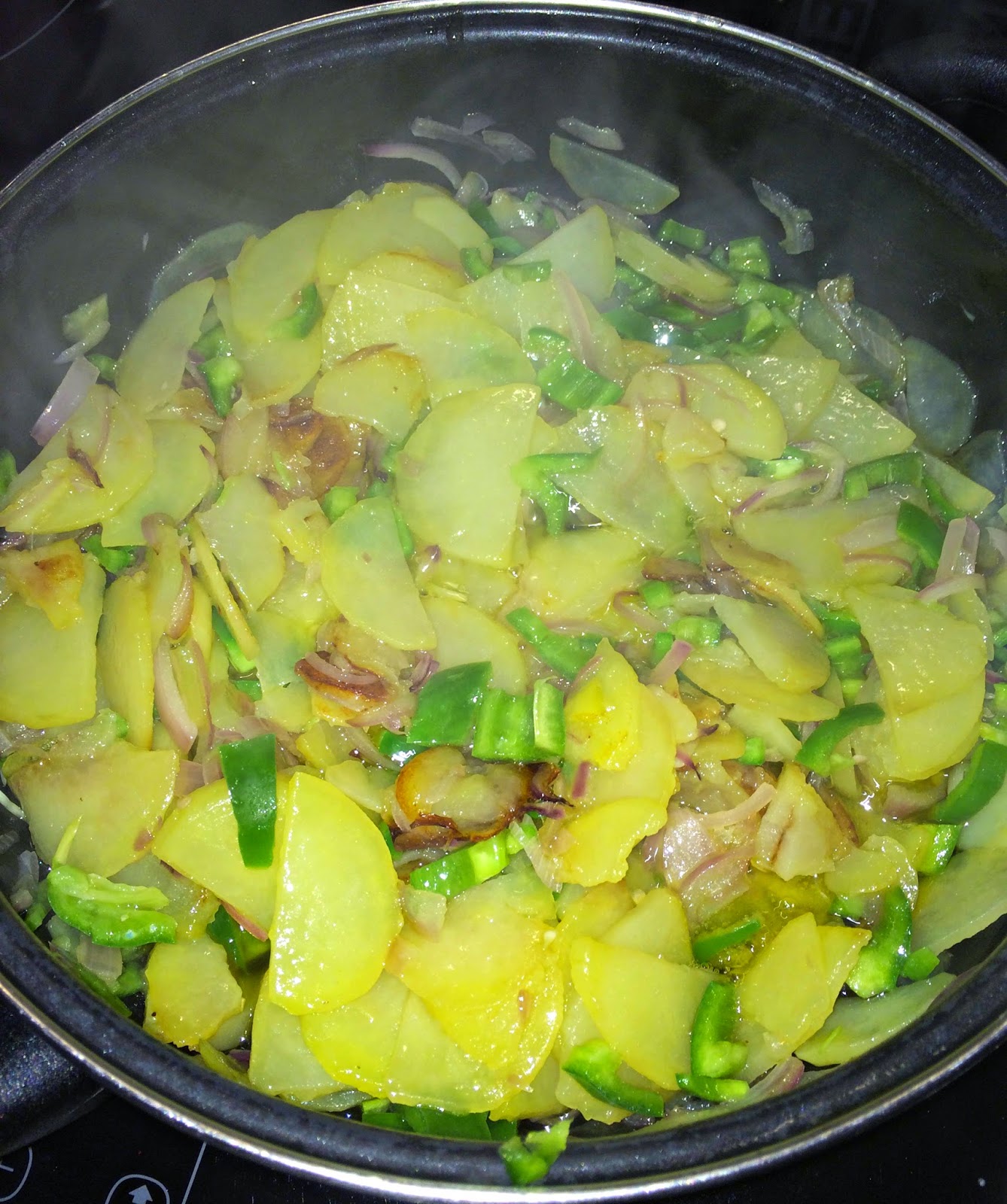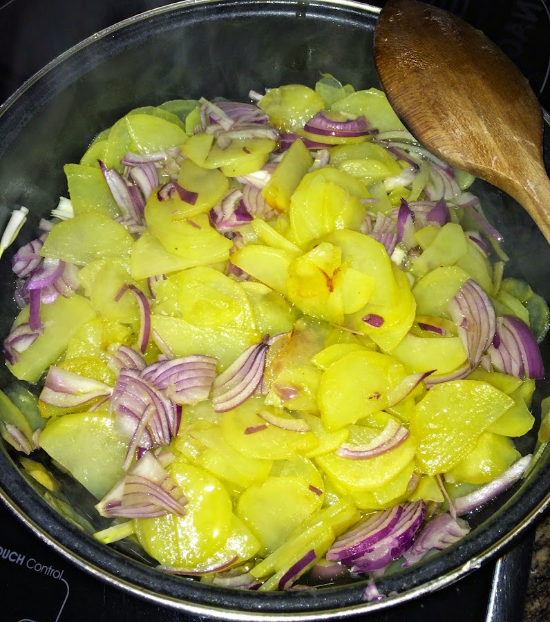 Al principio las removeremos para que se despeguen y unten bien de aceite, luego la dejaremos que se vayan pochando con tranquilidad. Mientras vamos cortando una cebolla en juliana finita, y cuando la patata lleve 10 minutos la añadimos y removemos con cuidado para no romper la patata.