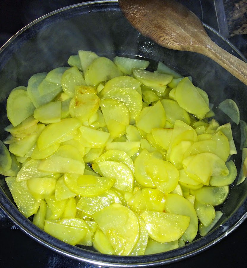 Vamos a cortar, la cantidad de patatas que queramos, en panadera, rodajas muy finitas, como para hacer tortilla de patata. Las pondremos en una sartén grande o cacerola baja y ancha con bastante aceite a fuego suave para que se vayan cocinando lentamente y ablandando.