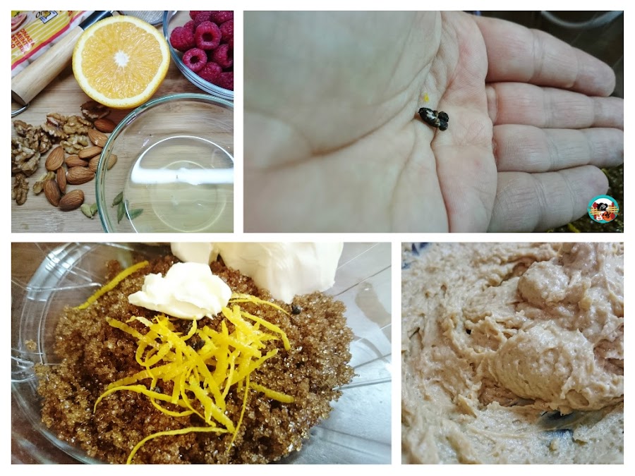 1.- En un bol ponemos la margarina a temperatura ambiente, la mezclamos con el azúcar, incorporamos la ralladura de naranja, las semillas de cardamomo y batimos bien con la varilla manual. Incorporamos la harina con la levadura tamizada. Mezclamos todo bien con una espátula de silicona.