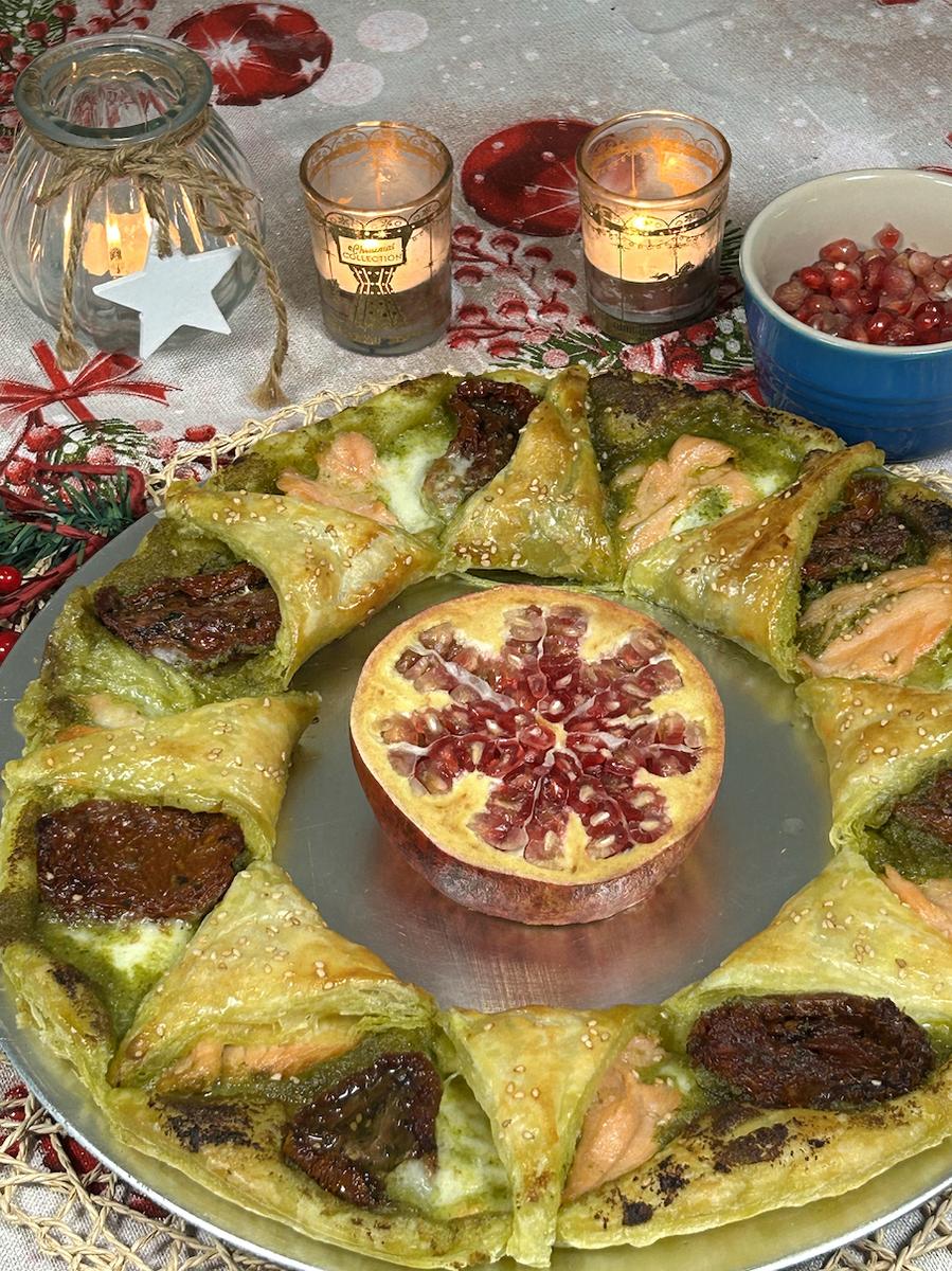 Estrella o corona de Navidad de hojaldre relleno de salsa pesto, tomates secos, queso mozzarella sin lactosa y salmón ahumado, decorada con granada.