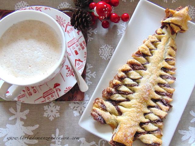 Hoy os enseño la corona que he publicado ya dos veces este mes. La primera vez la hice utilizando 2 láminas de hojaldre con mantequilla redondas. Es más fácil de hacer con láminas rectangulares. En el primer caso sale una circunferencia más pequeña y en el segundo más grande. No os excedáis en la cantidad de Nutella, nocilla o crema de cacao y avellanas, si pecáis de untar demasiada pierde la forma más fácilmente. La idea para hacerla la encontré aquí. Por cierto, tengo pendiente publicar la versión casera de Nocilla o Nutella. Con esta forma queda de lo más navideña ¿no os parece?