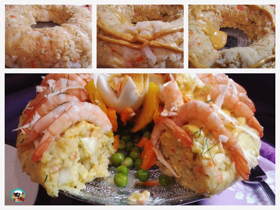 4.- Esparcimos sobre la ensaladilla un poco de salsa de mango curry. Rellenamos el circulo con los guisantes, bien escurridos. Y la zanahoria cortada en trozos. Pelamos los langostinos, dejándole solo las colas. Los colocamos alrededor de la corona, dejamos dos para decorar el centro. Cortamos en gajos un cuarte de mango, lo ponemos en el centro de la corona. Cortamos el huevo que nos ha sobrado en forma de flor, los ponemos en el centro de la corana y dentro de estos los langostinos que hemos reservado para decorar.