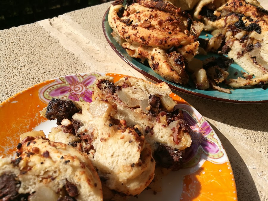 Bueno, bueno, bueno...que pedazo de blog nos ha tocado asaltar este mes...nada menos que el blog de Pilar Casanava Per sucar-hi pa. Os recomiendo que pinchéis el enlace y os déis un paseíto por sus recetas, que son una pasada de ricas y bonitas! Yo estuve muuucho rato hasta que me decidí por esta corona de morcilla y pera, que también lleva bacon y pistachos...o sea...una bomba de relojería, pero lo empiezas a comer y está taaaan bueno que no puedes parar!!