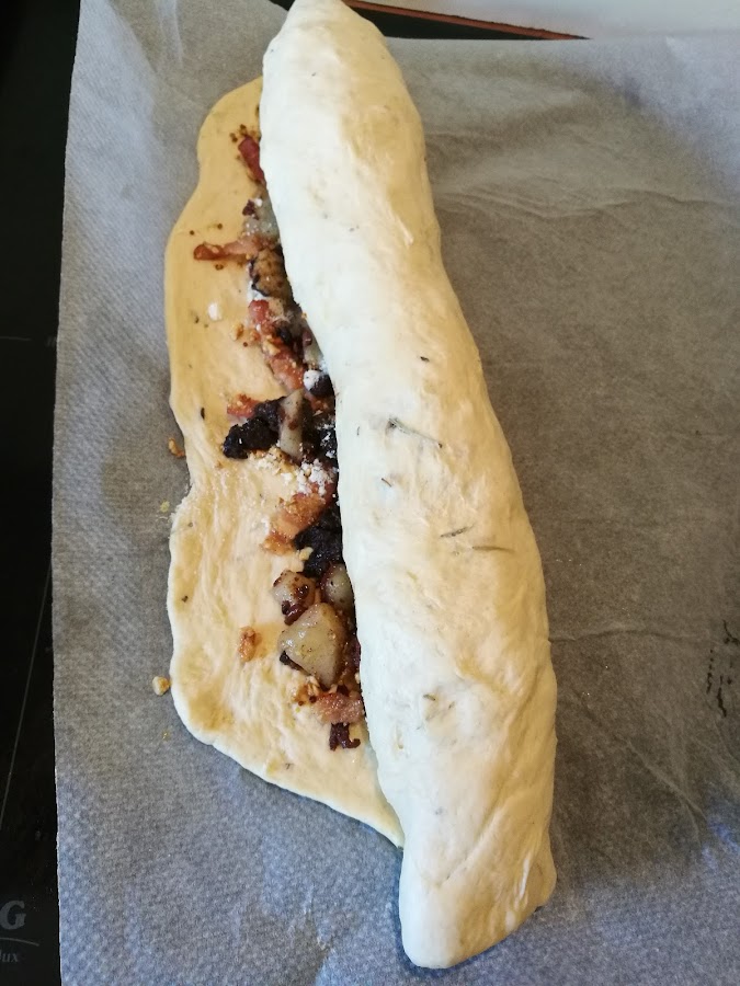 Uno de mis fallos fué poner demasiado relleno, con lo cual me quedó un rollo gordote, que luego era casi imposible de trenzar, pero lo importante es que estaba buenísimo!! Gràcies Pilar!!
