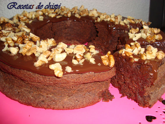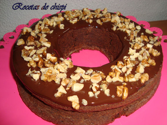 Dejar enfriar en el molde. Desmoldar, fundir el chocolate de cobertura y echar por encima de la corona y decorar con las nueces picadas.