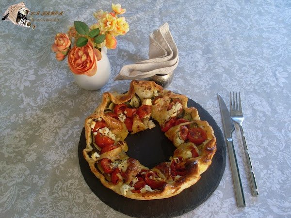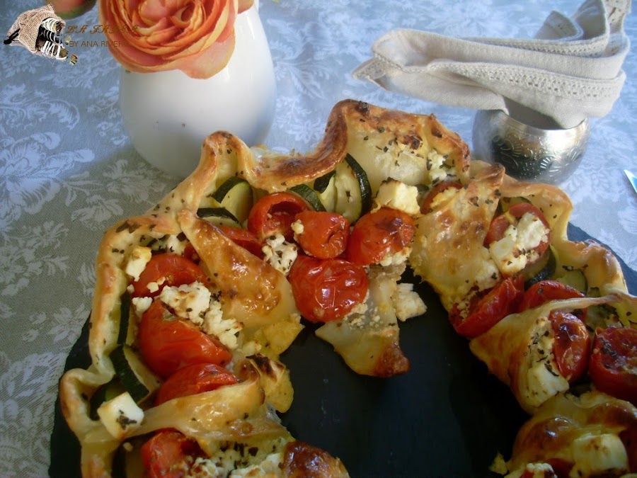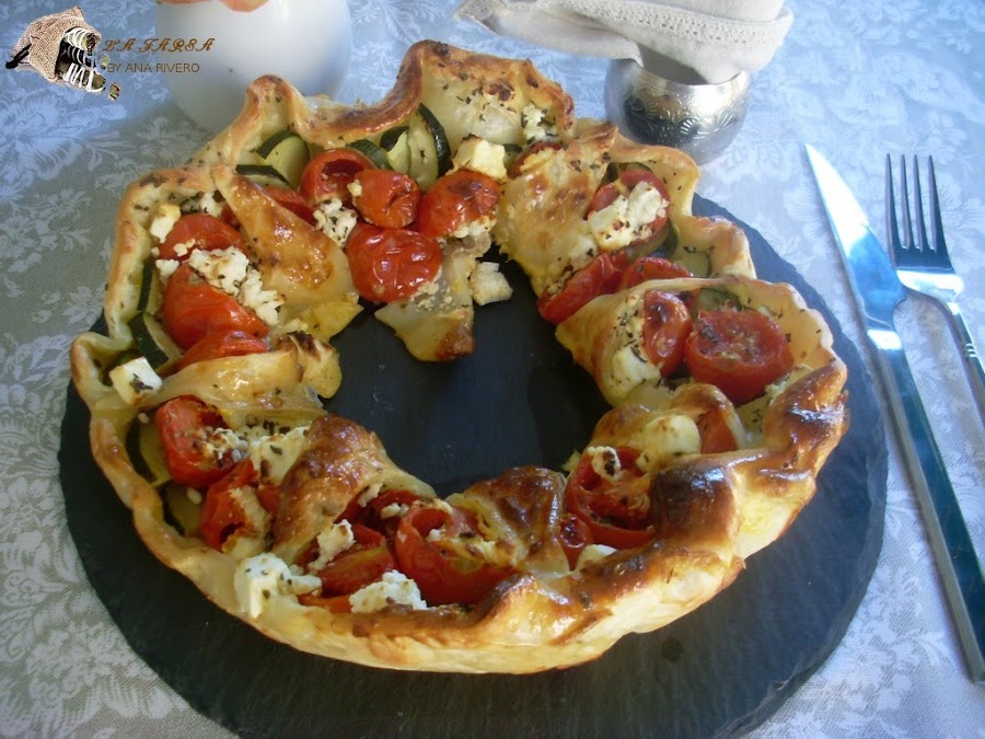 Repartir el calabacín, los tomates y el queso por todo el borde de la pizza
