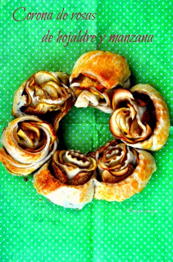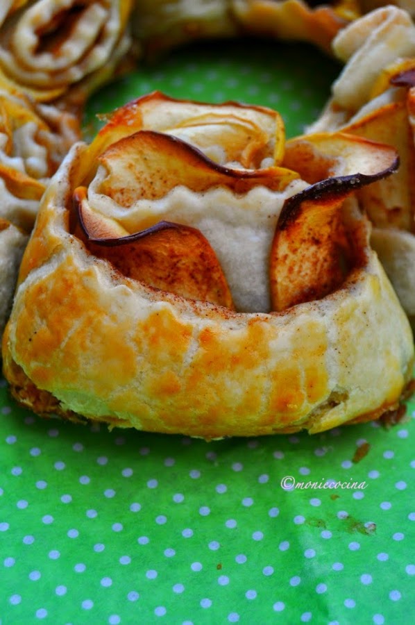 Ponemos láminas de manzana a lo largo de cada tira de hojaldre y enrollamos formando la rosa. La colocamos en el molde elegido y así sucesivamente todas las tiras. Pintamos con huevo batido para darle un toque dorado al hojaldre y horneamos a 180 grados unos 20 minutos hasta que estén un poco doradas.