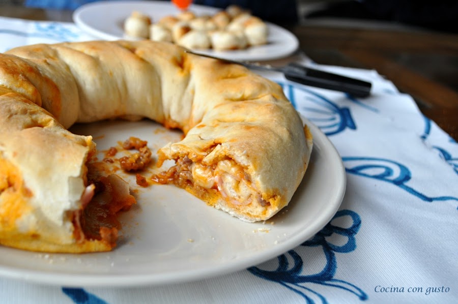 Freimos la carne picada y le echamos una cucharada de tomate frito y una de salsa barbacoa. Dejamos templar. Extendemos la masa en forma de rectágulo. Sobre este, ponemos un poco de tomate frito, el queso mozarella, la carne picada y las tiras de bacon y enrrollamos. Sólo quedar unir los extremos para que tenga forma de corona. Dejamos reposar media hora y horneamos a 180º durante unos 20-25 minutos.