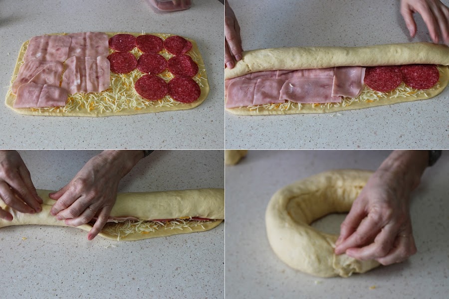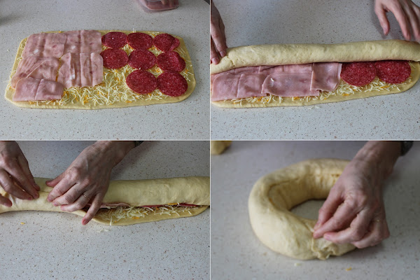 Yo me he decidido por esta Corona rellena de 4 quesos , salami y jamón cocido que queda deliciosa y es una estupenda cena o comida para llevar a la piscina, campo o playa, para merendar, para un aperitivo...ahora que ya va a empezar el buen tiempo.
