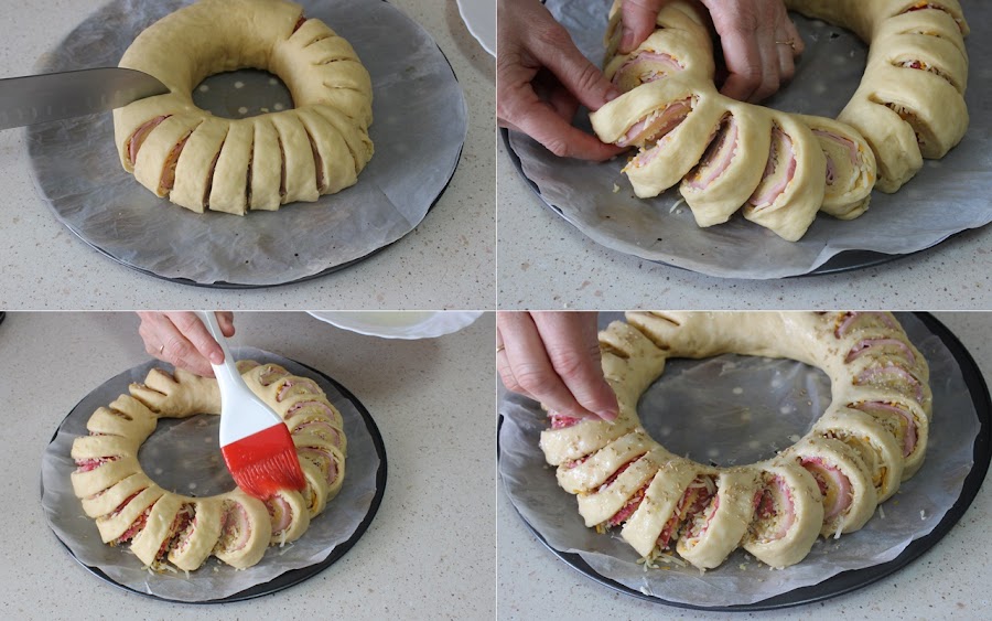 La enrollamos como si se tratase de un brazo de gitano y la colocamos en forma de corona, sellamos bien los bordes.