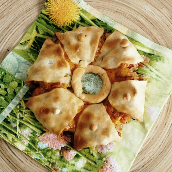 Extendemos la masa titos muy muy fina y hacemos triángulos. Juntamos los triángulos por la base haciendo la forma de una especie de sol haciendo una especie de base en el centro. Ponemos el relleno en la base, el queso por encima y vamos cerrando las puntas de la masa para dar forma a la corona dejando unos huecos intermedios.