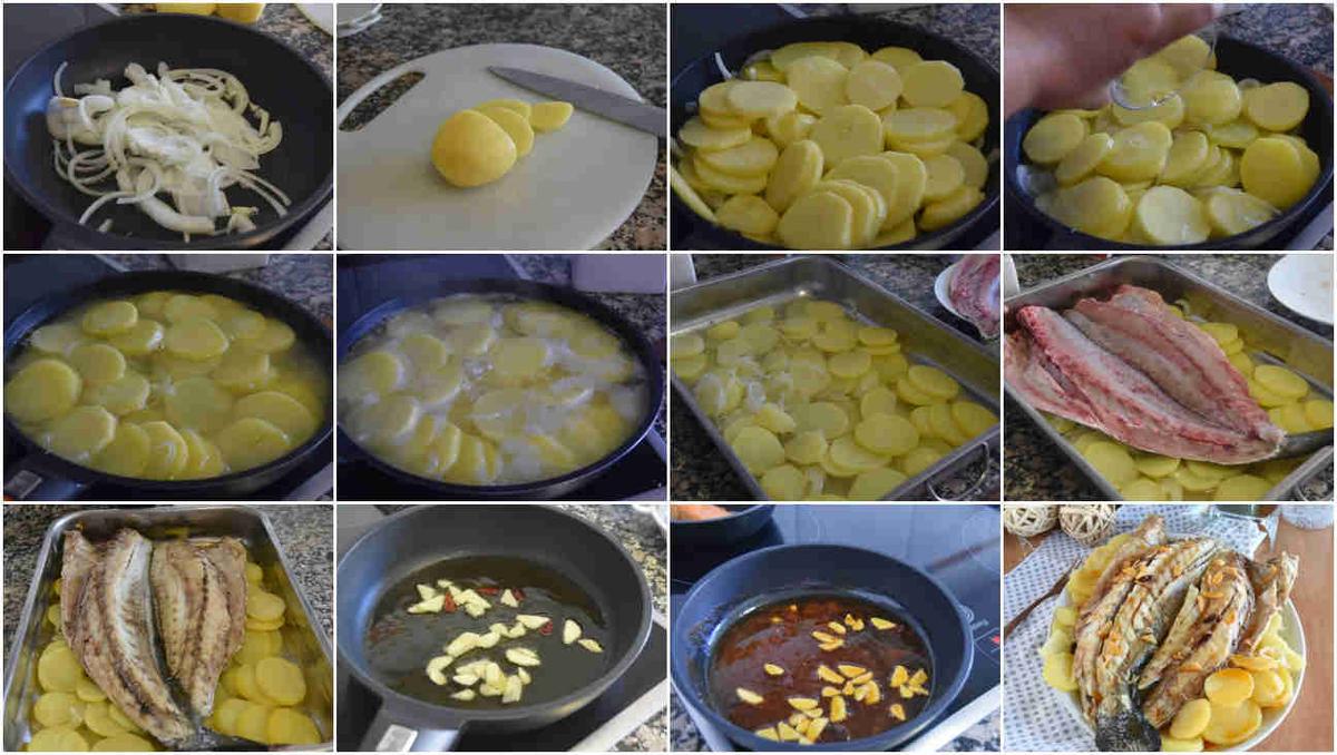 Colocamos las patatas y el pescado en una bandeja y reservamos el jugo que haya soltado durante su cocción.