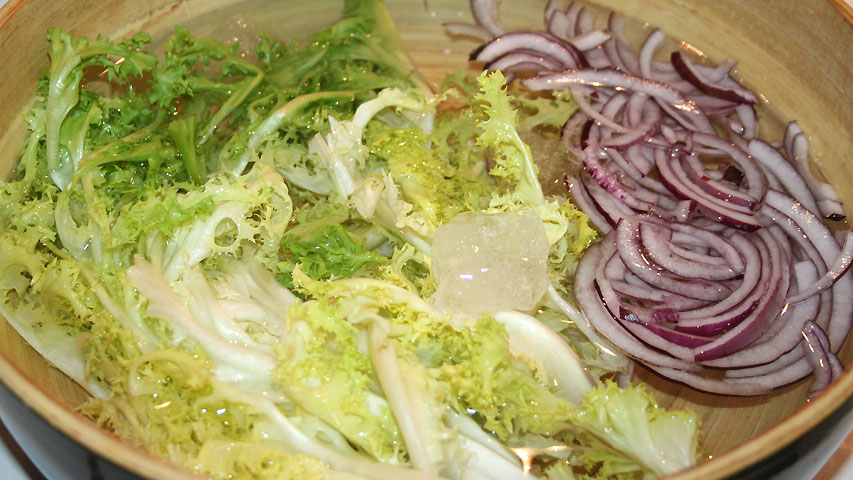 Pela la cebolla roja, córtala en juliana fina e introdúcela en el bol junto a la escarola.
