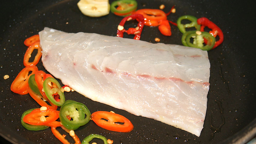 Prepara una sartén a fuego muy fuerte con unas gotas de aceite de oliva. Introduce el ajo, las guindillas y haz la corvina. Esta se hace en apenas medio minuto por cada lado.