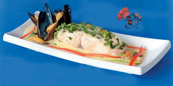 Colocar los Lomos de Corvina cuando estén listo sobre un plato y bañar por encima con la Salsa y acompañar de los mejillones espolvorear de perejil picado.