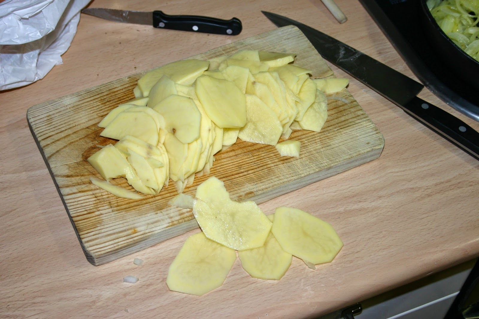 cortamos las patatas muy finitas, casi como para chips, tener en cuenta que si las partis muy gordas se os quedaran duras, para cortarlas finas necesitareis un cuchillo bien afliado y maña.