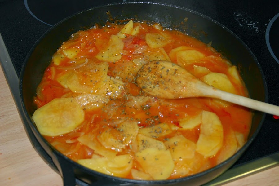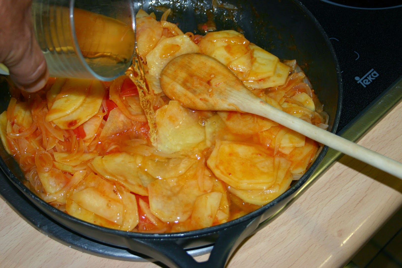 cubri las patatas con agua, pero si quereis podeis echar caldo de pescado