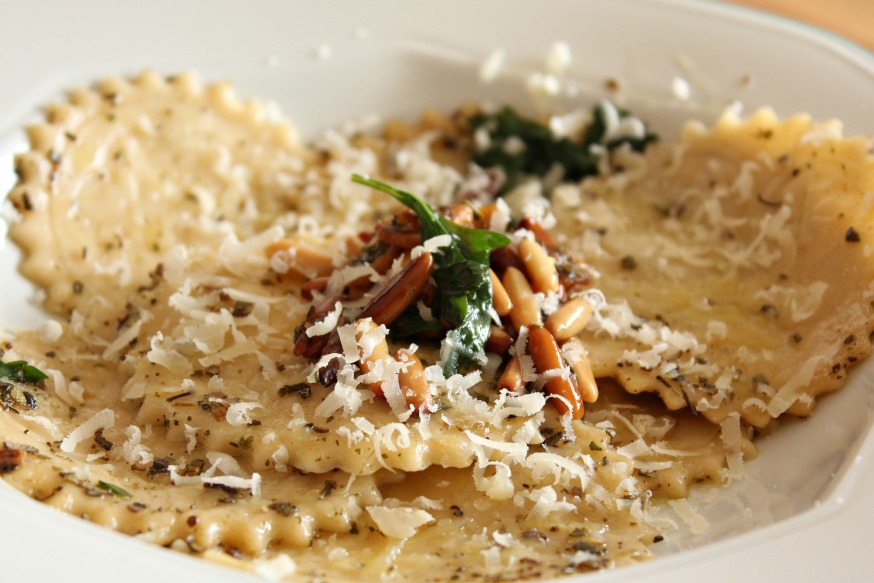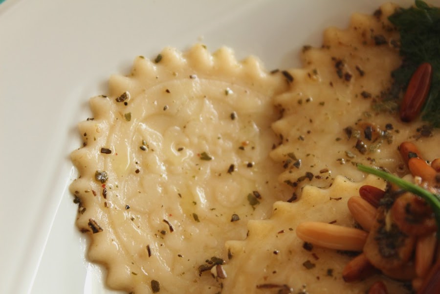 En una sartén, ponemos un poco de aceite y un ajo laminado. Dejamos que se dore y añadimos los piñones y las hierbas.