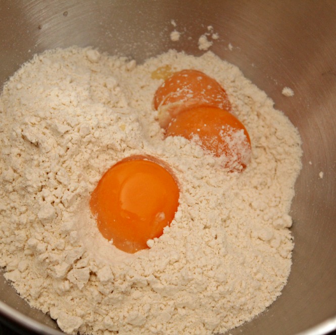 Como siempre, volcán con la harina, y en el centro, las yemas. O, en un bol grandote, o en la amasadora vamos mezclando.