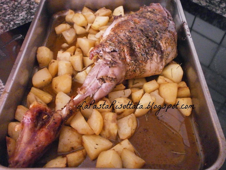 Hornear en horno precalentado a 250º durante 10 minutos, bajar a 200º y continuar la cocción durante 40 minutos. En este punto, abrir el horno y rociar con el vino. Cerrar el horno. Después de media hora se añaden las patatas, peladas y cortadas en trozos. De vuelta al horno. Después de unos 15 minutos dar vuelta a la pierna, añadir un poco de aceite y espolvorear las patatas con sal gruesa y romero.Subir el horno a 250º y hornear otros 15 minutos.
