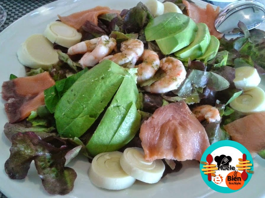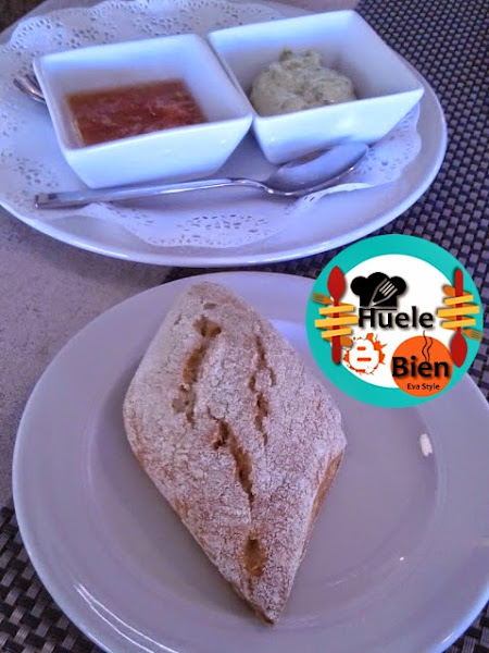 Antes de tomar el primer plato: una ensalada de palmitos con langostinos y salmón ahumado, nos trae pan con dos salsas para ir picando mientras chateamos.