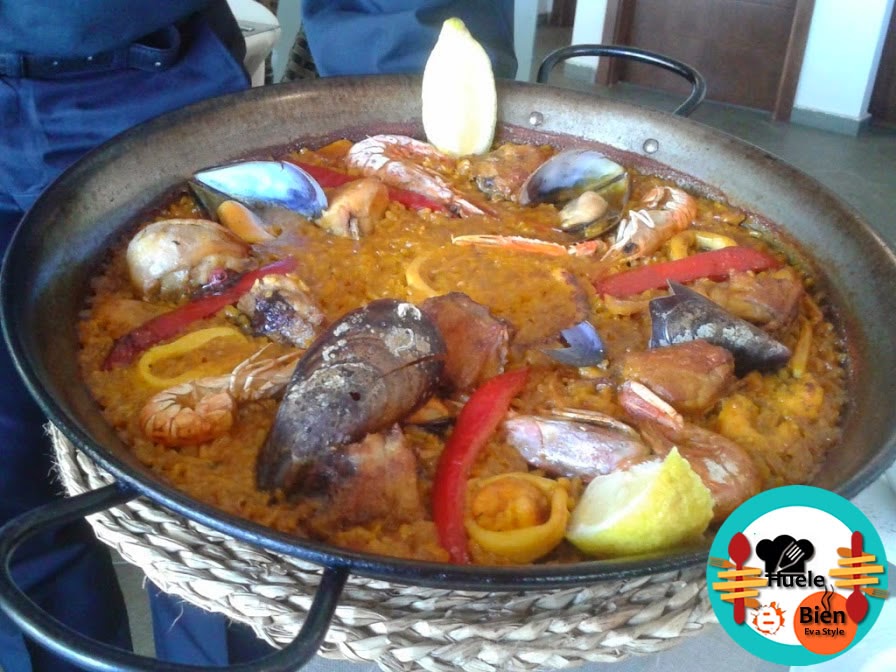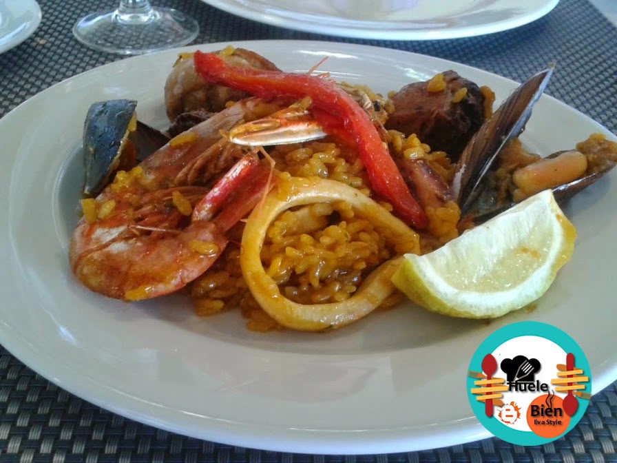 De segundo, tomamos una exquisita paella mixta para dos. ¡Con un aspecto impresionante!... El camarero amablemente posa unos segundos con ella, para que pueda tomar algunas fotos.