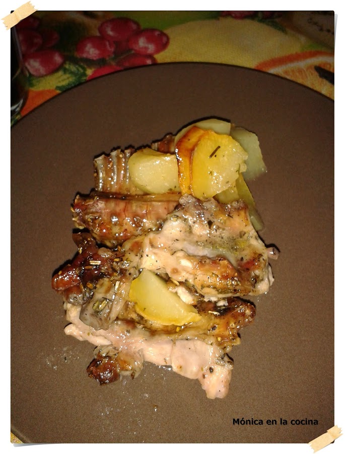 Salpimentar y ponerles por encima las hierbas provenzales junto con un buen chorro de aceite de oliva, el vino y el agua. Introducir en el horno precalentado a 190º. Sacar a los 15 min. y poner en el fondo de la bandeja las patatas cortadas a rodajas un poco gruesas.