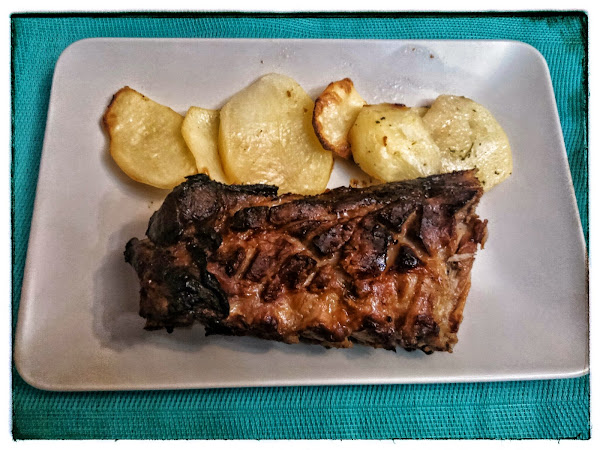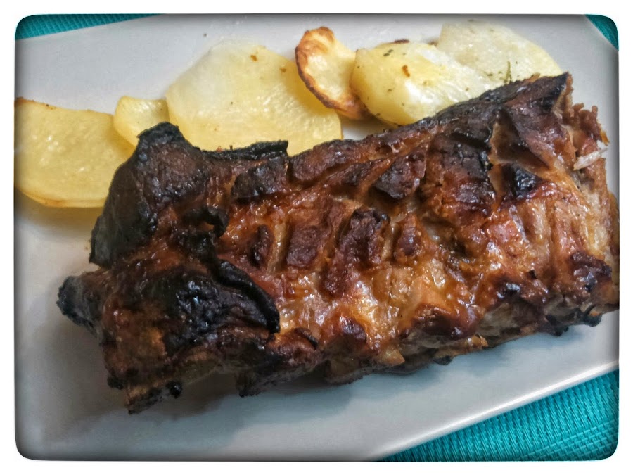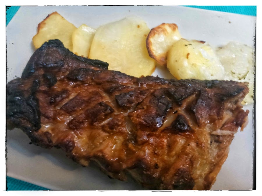 Cuando la patata este blandita, retiramos la bandeja del horno y ya tenemos unas ricas costillas preparadas para comer.