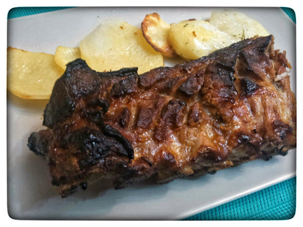Colocamos los costillares en la mitad del horno y dejamos a 200 grados unos 15 minutos y luego bajamos la temperatura a 180 dejándolo hornear poco a poco , cada 10 minutos pintaremos las costillas con nuestra mezcla batida , pues esto hará que coja un sabor buenísimo , más o menos le daremos la vuelta a los costillares cuando pasen 30 minutos haciendo lo mismo por el otro lado , cuando queden unos 15 minutos incorporamos las patatas cortadas en laminas de 1 cm y las dejamos hornear con un poco de la mezcla batida .