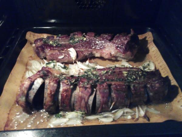 4.- Colocamos las costillas (que previamente ha marcado el carnicero) en la bandeja de horno que tenemos preparada con una lámina de silicona en el fondo, y las embadurnamos bien con la mezcla que hemos preparado.