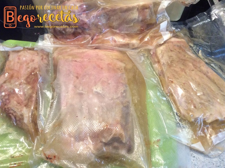 Vamos calentando el agua a 75º, y mientras tanto embolsamos al vacío las costillas partidas en trozos con sal y una nuez de mantequilla.