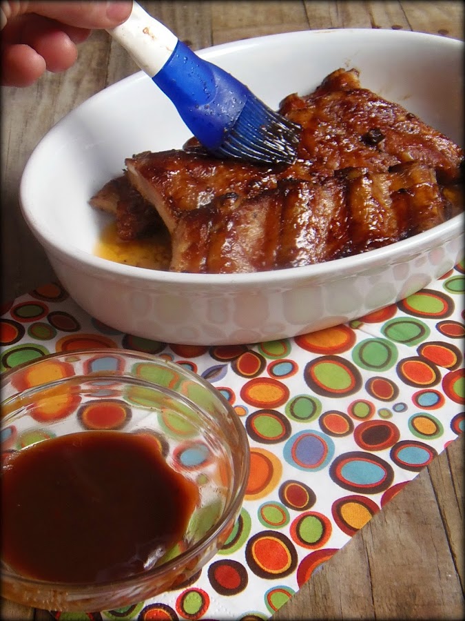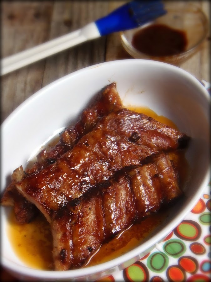 En un bol mezclamos todos los ingredientes hasta que queden bien integrados, salamos las costillas y con un pincel vamos empapando la carne. La colocamos en una bandeja horno, que ya lo tendremos precalentado a 180º, dejamos que se vayan haciendo, las damos la vuelta y volvemos a pincelar hasta acabar la mezcla. Cuando ya casi las tenemos hechas, en los últimos diez minutos volvemos a pincelarlas ésta vez solo con salsa barbacoa y subimos el horno a 200- 210 grados y ya la tenemos listas.