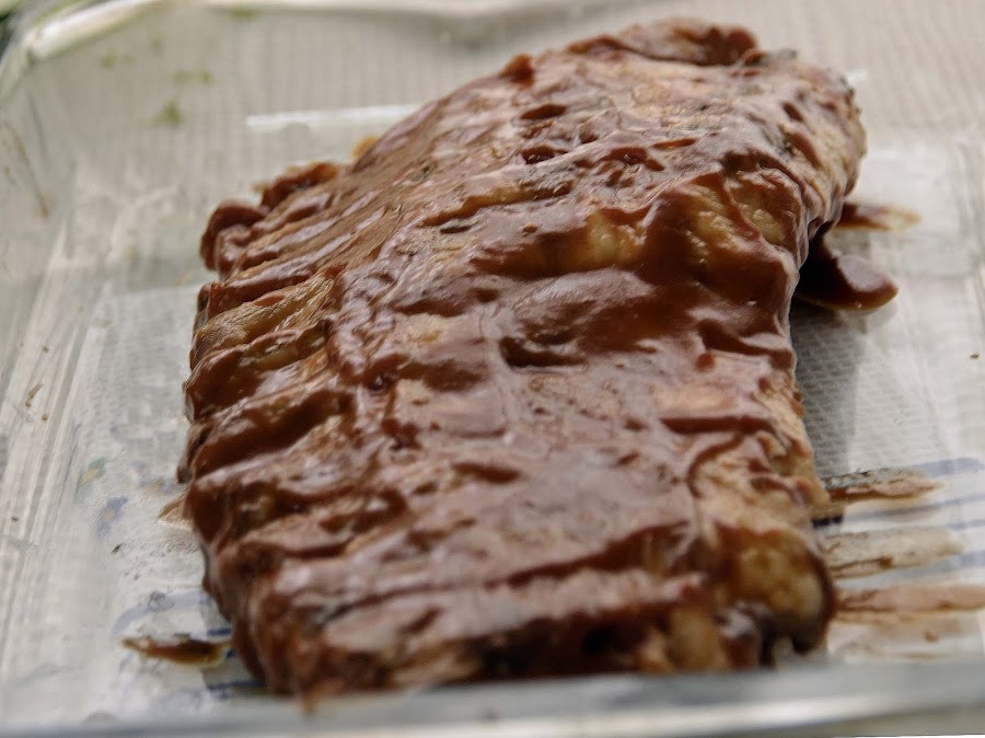 Cuando ya estén cocidas las sacamos del caldo y las dejamos enfriar, ( el caldo lo reservamos ,podemos hacer una sopa de fideos o de arroz con el ). Es muy importante dejarla enfriar antes del siguiente paso cuando ya este fría le ponemos una buena capa de salsa barbacoa por todas las partes.