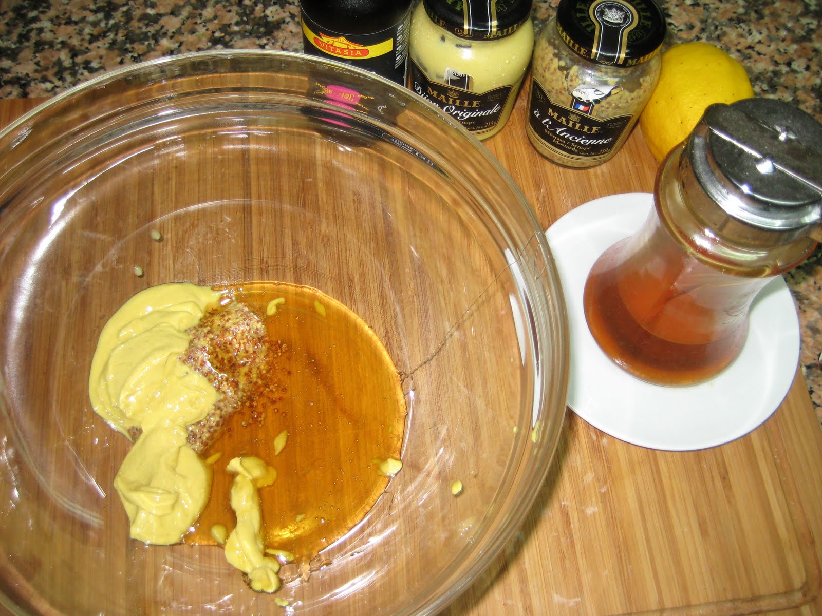 Ponemos en un bol las mostazas, la miel, la soja y el zumo de limón. Las cantidades son un poco relativas, si os gusta mas picante poned un poquito más de la de Dijon y si os gusta más dulce, un poquito más de la mostaza antigua. Se mezcla todo y se salpimenta al gusto.