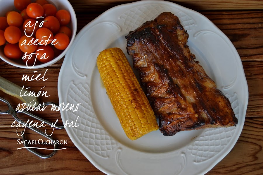Yo los he acompañado de unas mazorcas de maíz ya cocidas que he puesto en el horno junto con las costillas 10 minutos antes de sacarlas. También las he untado con la marinada.