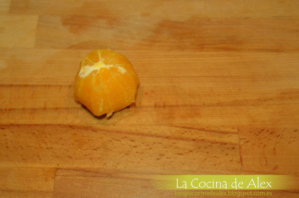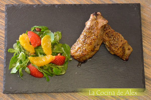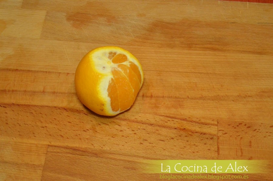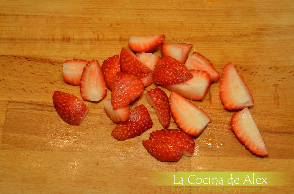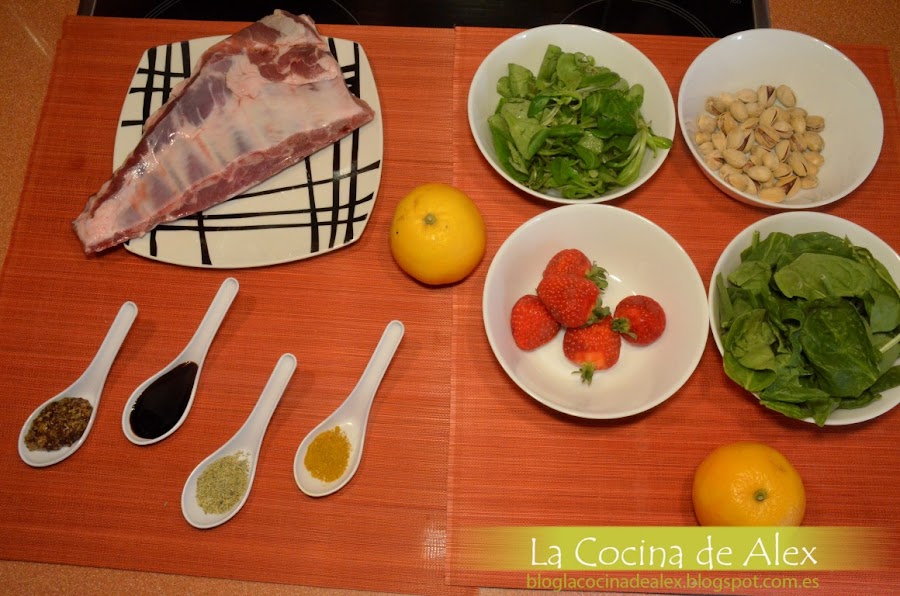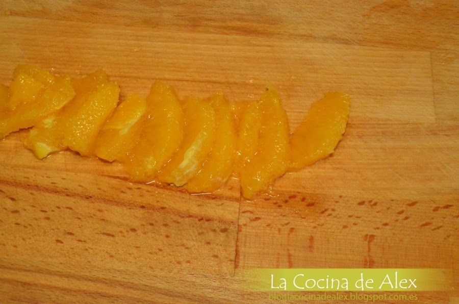 Mientras maceramos las costillas, preparamos la ensalada de acompañamiento, cortamos las fresas en cuartos y sacamos los gajos limpios de naranja.