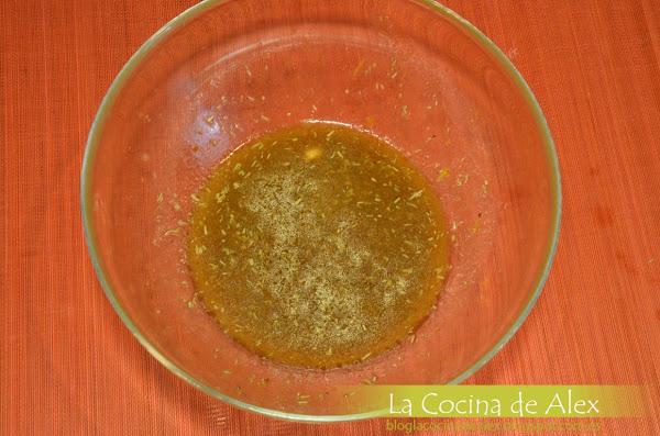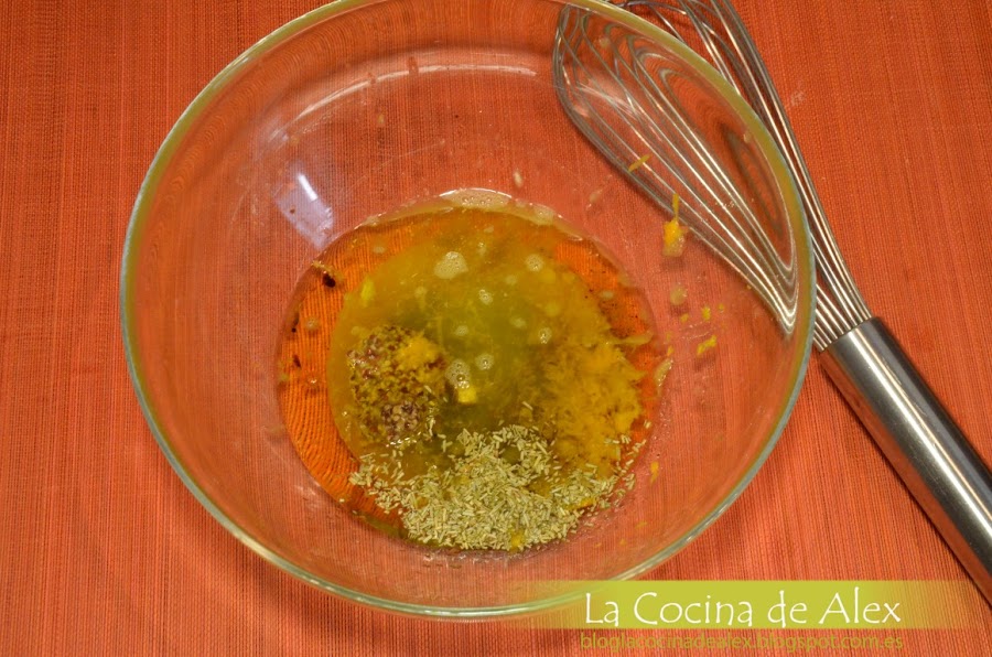 En un bol amplio ponemos el aceite de oliva, la pimienta molida, la ralladura de la naranja, el zumo de la misma naranja, la mostaza, el romero, el curry y la salsa de soja y lo mezclamos todo bien con unas varillas.