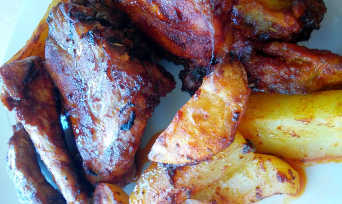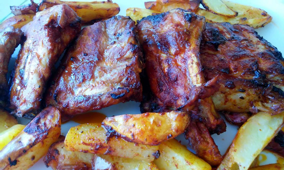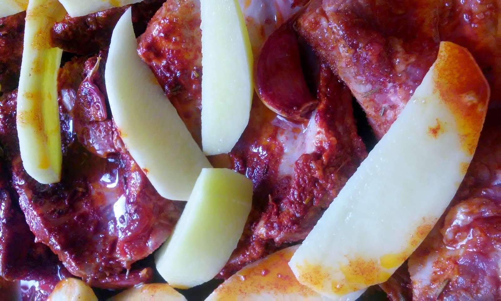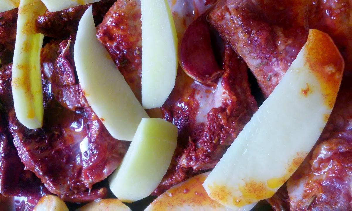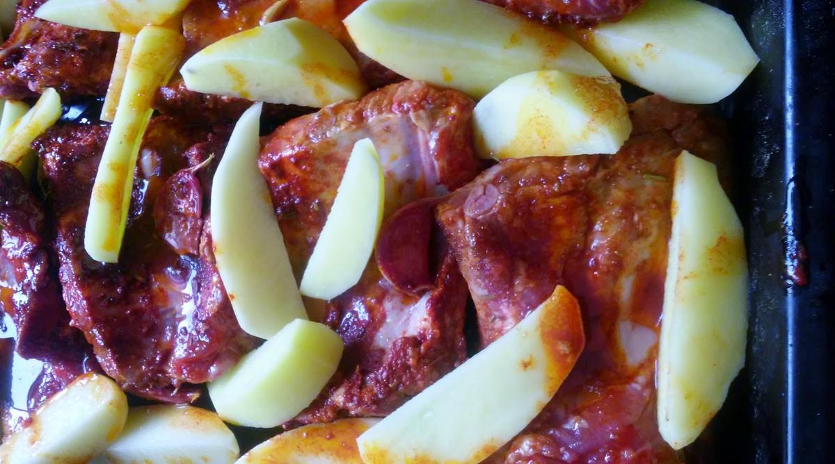 Las disponemos en una bandeja de horno con las patatas peladas y cortadas en gajos y echa por encima el adobo sobrante.