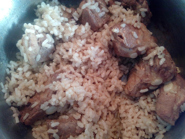 Yo en este caso las frei en una sarten,mientras se hacian a fuego lento puse a hervir un poco de arroz.Cuando estaban hechas las costillas las saque de la sarten y en el jugo que dejaron puse el arroz cocido y lo rehogue en el un poco.