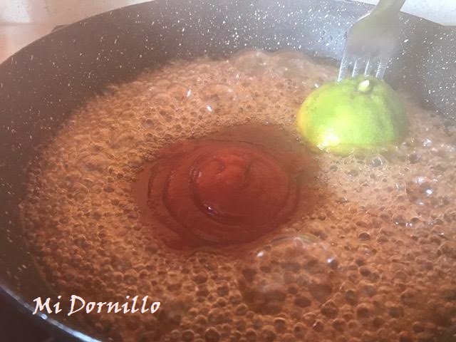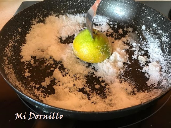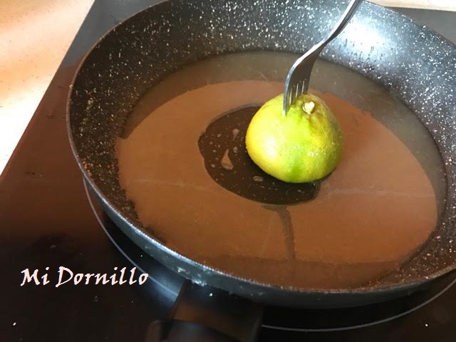 4º En una sarten ponemos el azúcar y con la ayuda de un limón pinchado con un tenedor,