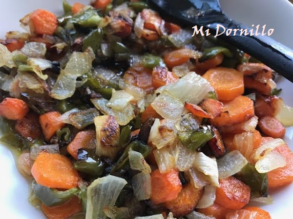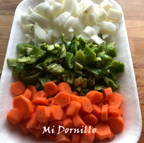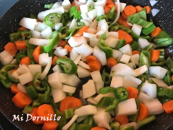 3º/Aparte empezamos hacer la salsa agridulce. Picamos bien todas las verduras, y rehogamos en un poco de aceite,deben quedar bien doraditas en una sarten o work.