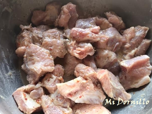 1º/ La noche anterior ponemos las costillas troceadas a macerar con sal, aceite, zumo de limón y sazonador de barbacoas.