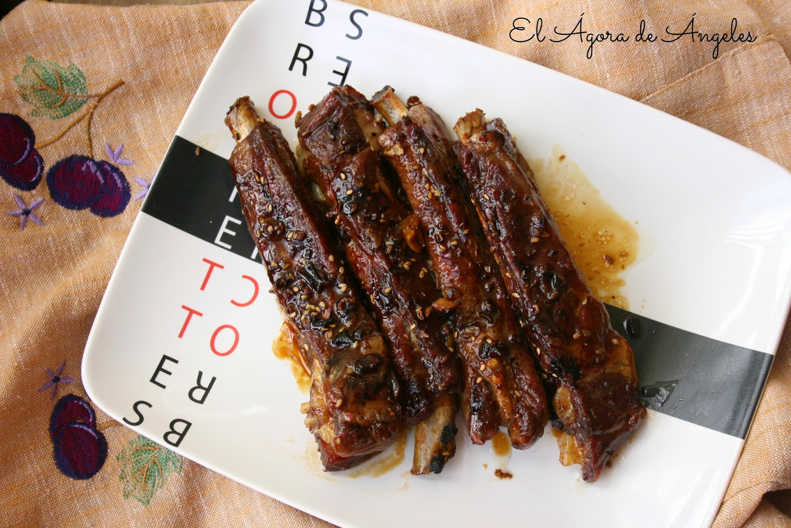 Cuando las costillas estén asadas,sacarlas del horno,volver a calentar la salsa de miel y servir por encima o en salsera aparte.
