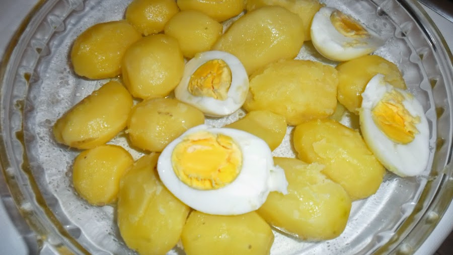 Mientras asamos las costillas,podemos preparar la guarnición y la acompañamos de abundante salsa caliente.Yo las pongo con patatas cocidas y huevos con un chorrito de aceite de oliva y sal o mayonesa.