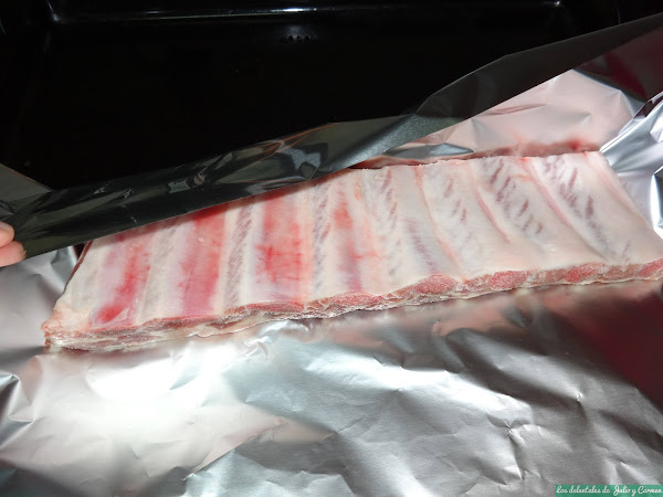 Envolvemos las costillas en papel de aluminio y las pondremos un una bandeja de horno. Las metemos y las dejaremos hornearse con el papel 1 hora y media.