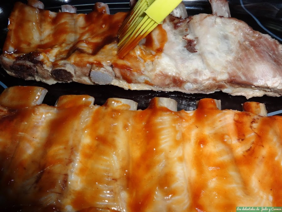 Pasados de nuevo los 10 minutos, abrimos el horno y con cuidado y ayuda de unas pinzas, daremos la vuelta a las costillas, pintando esa cara con la salsa.