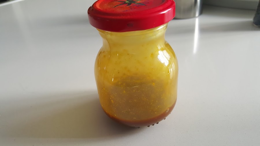 2. - En un bol , yo lo hago en un pequeño bote de cristal, aparte, mezclamos el aceite, la miel, la mostaza y la salsa de soja.