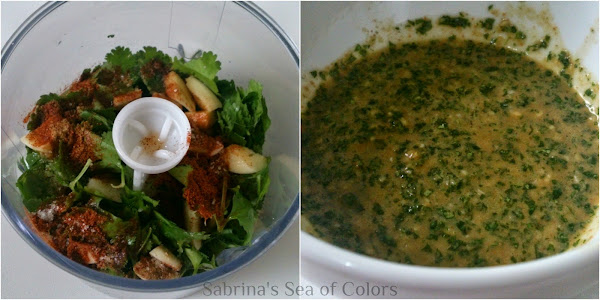Primero preparamos el mojo, así va macerando mientras hacemos el resto del plato. Picamos el cilantro y los ajos, los colocamos en la picadora junto al resto de los ingredientes y trituramos unos 2-3 minutos. Agregamos agua o aceite según notes la textura. Debe quedar líquido pero con consistencia y no demasiado aceitoso. Reservamos.